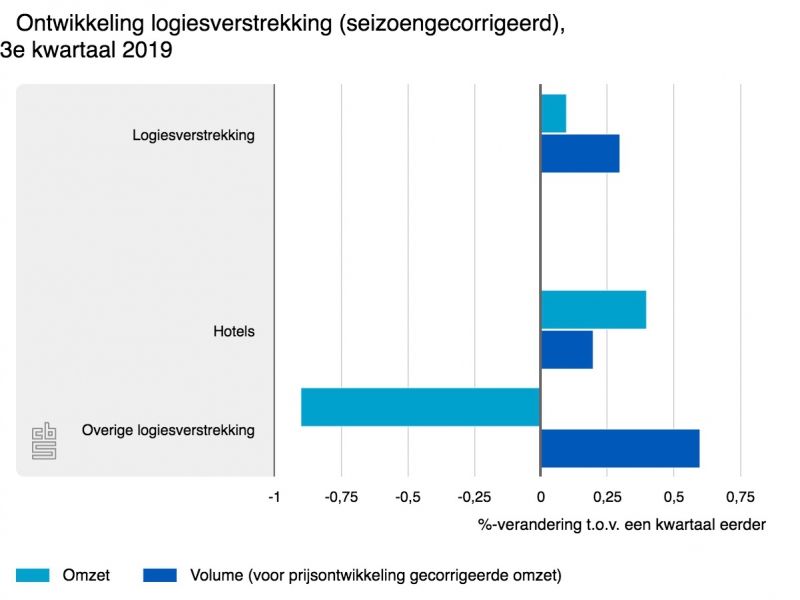 De omzet van logiesverstrekkers, waaronder hotels en vakantieparken, nam met 0,1 procent toe in vergelijking met een kwartaal eerder. Het volume, de voor prijs gecorrigeerde omzet, steeg met 0,3 procent.