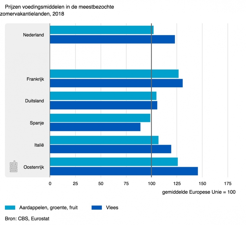 Frankrijk, Duitsland, Spanje, Italië en Oostenrijk zijn in de zomer de door Nederlanders meestbezochte vakantielanden. In vier van de vijf landen zijn de voedselprijzen hoger dan in Nederland. In de top vijf van zomervakantiebestemmingen van Nederlanders is alleen in Spanje voeding goedkoper. In Frankrijk liggen de voedselprijzen ruim 16 procent hoger dan gemiddeld in de EU. In Oostenrijk, het vijfde vakantieland op deze lijst, liggen de prijzen voor voeding bijna 27 procent boven het gemiddelde van de EU.